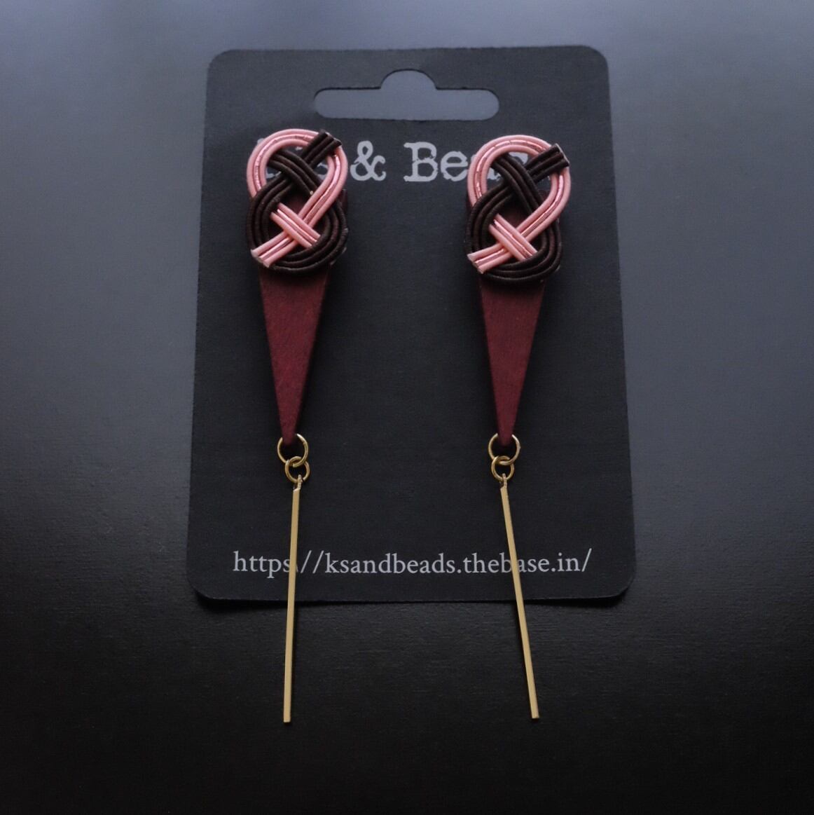 ピンク&ブラウンの水引と、ワインレッドの三角パーツとの、カラーコンビネーションがキュートなゆらゆらピアス。