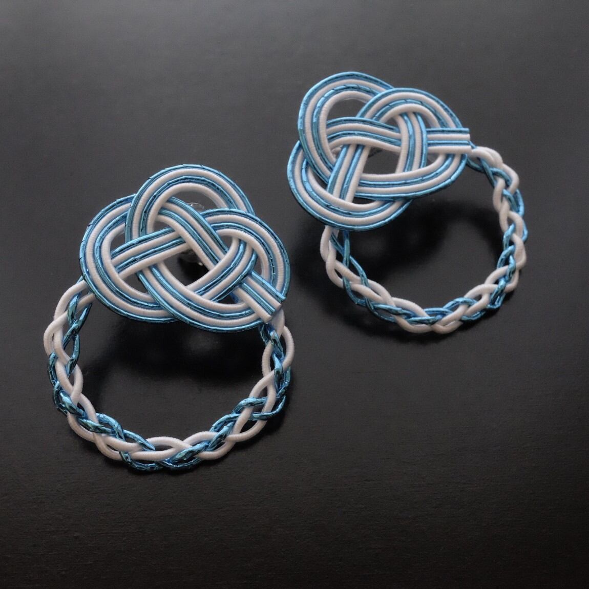 ホワイトと光沢のあるライトブルーの水引でできたフープピアス。夏にピッタリな爽やかなカラーコンビ。