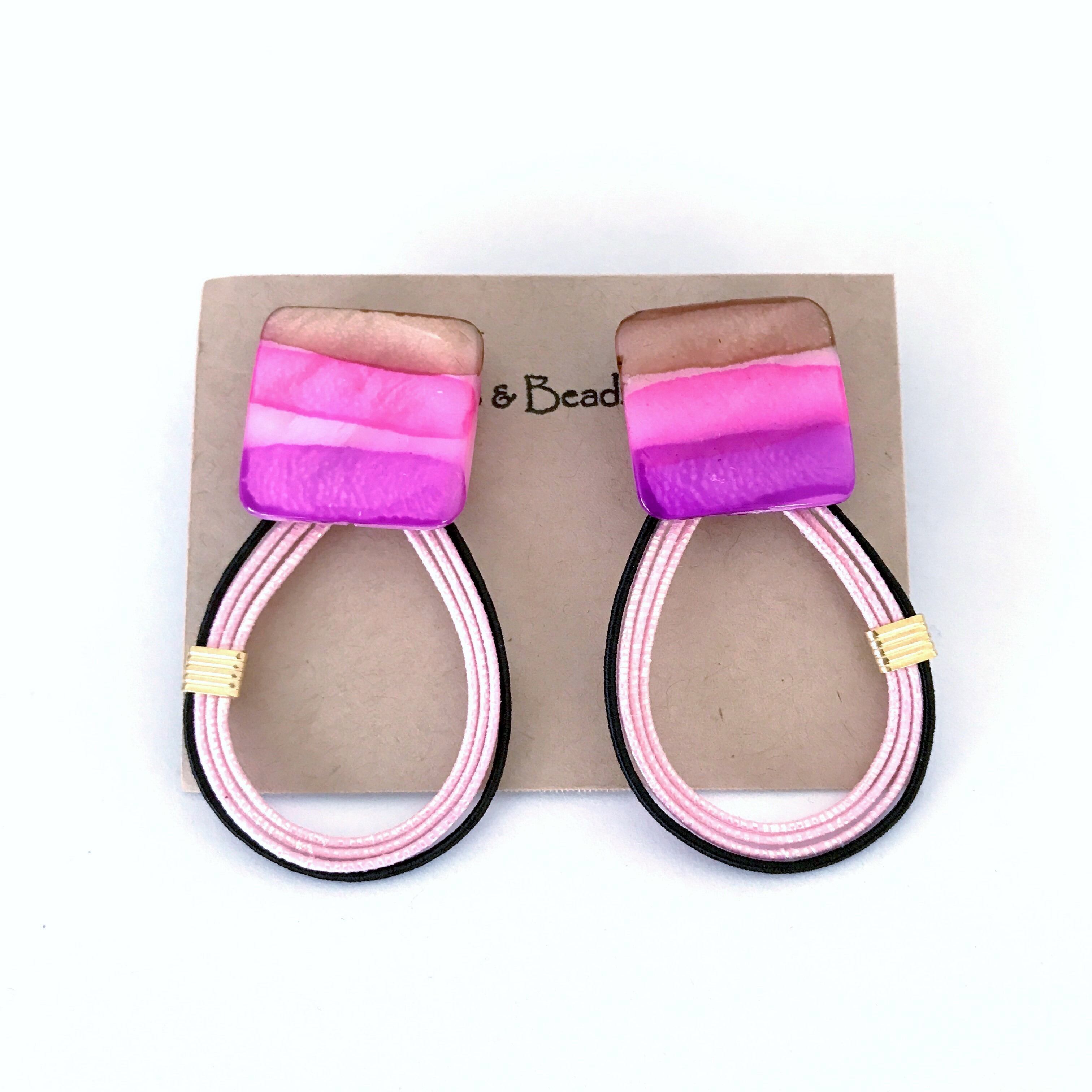 水引フープと、スクウェア・シェルビーズのピンク系コンビのキュートなピアス。水引を使っていながら和風になり過ぎないデザインなので、デイリーコーデにも取り入れやすいアイテム。