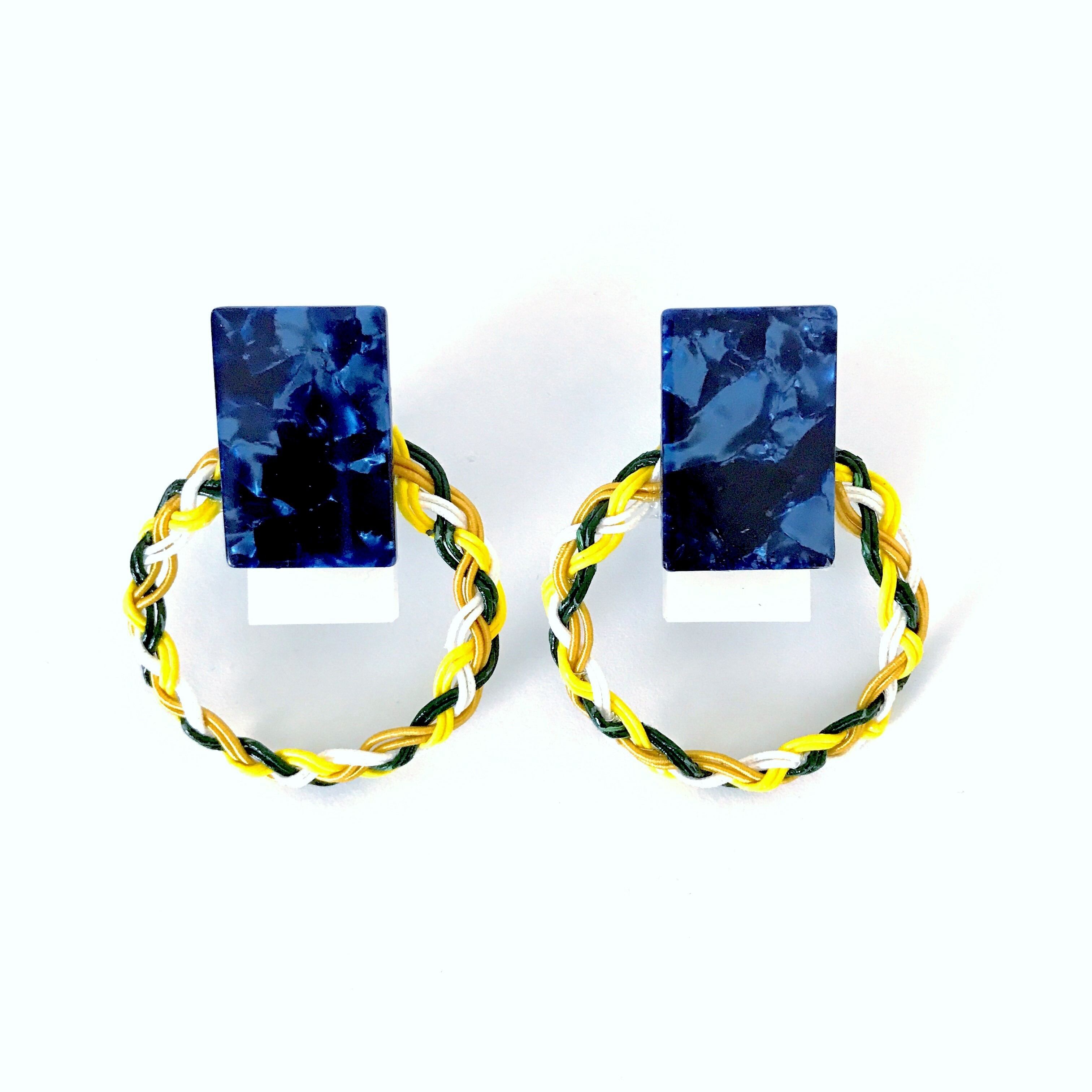 水引のフープと、アクリルのレクタングルと、レジンのレクタングルでできた幾何学ピアス。水引から醸し出される和の雰囲気と、ダブル・レクタングルとのシャープな感じが合わさった、カラーコントラストのあるアイテム。