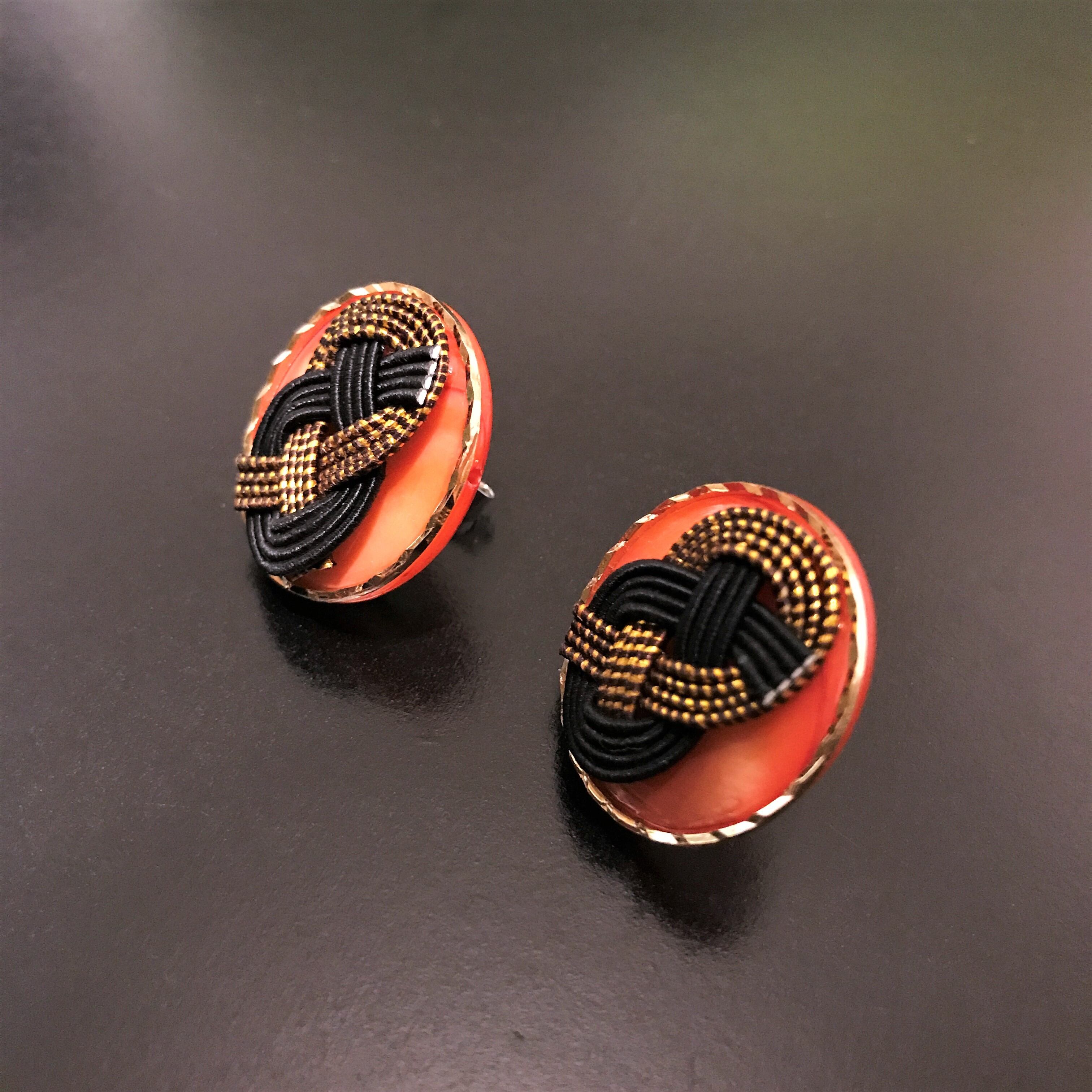 赤いシェルビーズを水引とメタルリングで飾ったボタン風ピアス。和風アクセとしても普段着にも合わせられるキュートなデザイン。