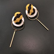 白いシェルビーズを水引、メタルリング、メタルロングチャームで飾ったボタン風ピアス。和風アクセとしても普段着にも合わせられるキュートなデザイン。