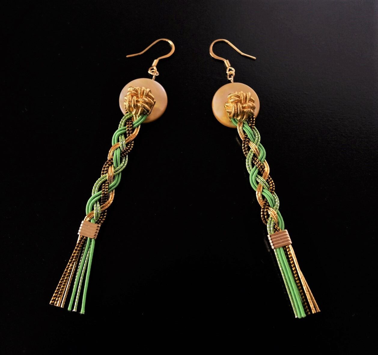 水引らしさを活かしたグリーン主体のマルチカラーのブレード+タッセルのピアス。水引とボタンのゴールドカラーによりゴージャス感たっぷり。