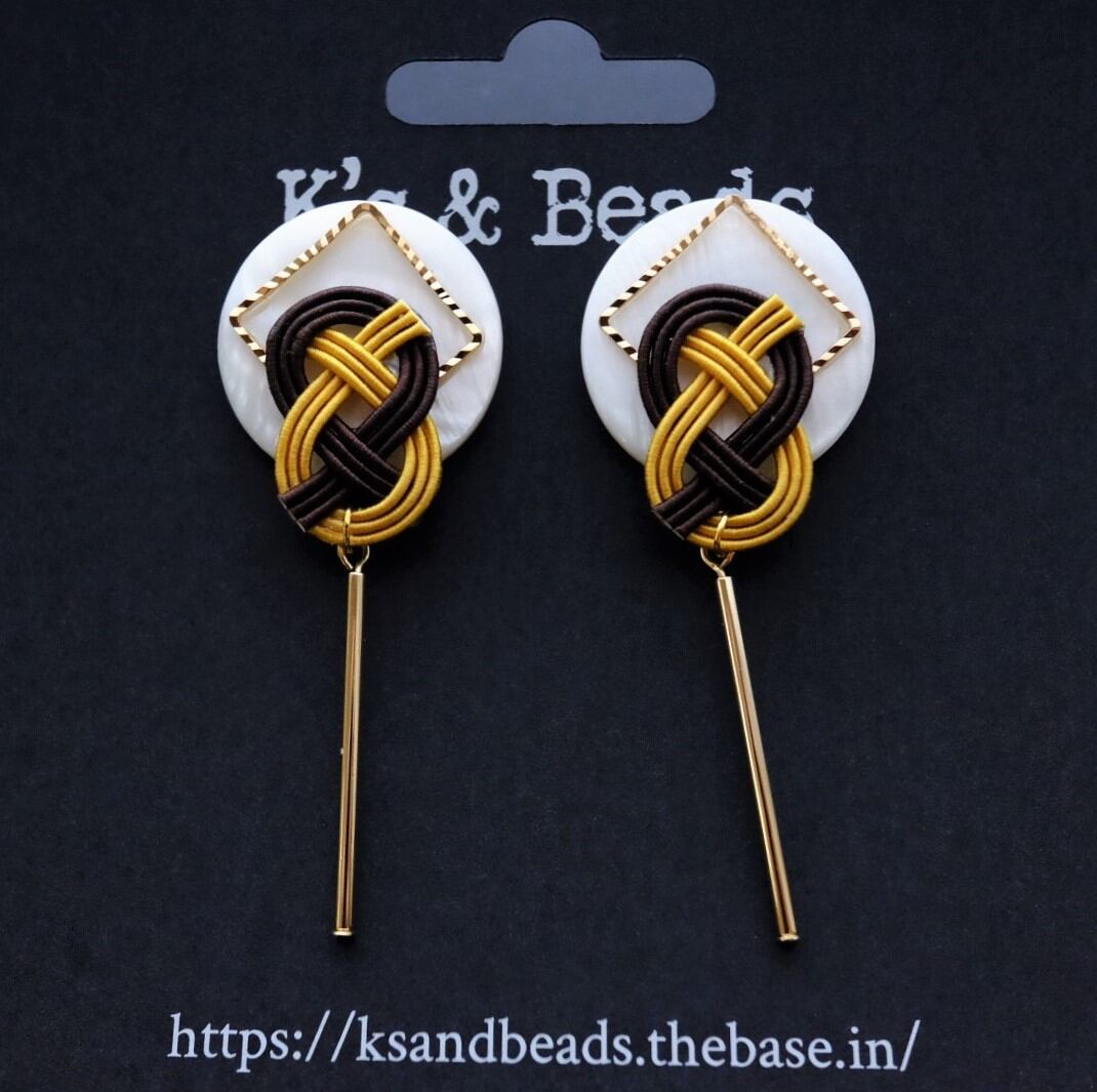 ホワイトのシェルビーズをマスタードイエローとブラウンの水引で飾ったボタン風のゆらゆらピアス。