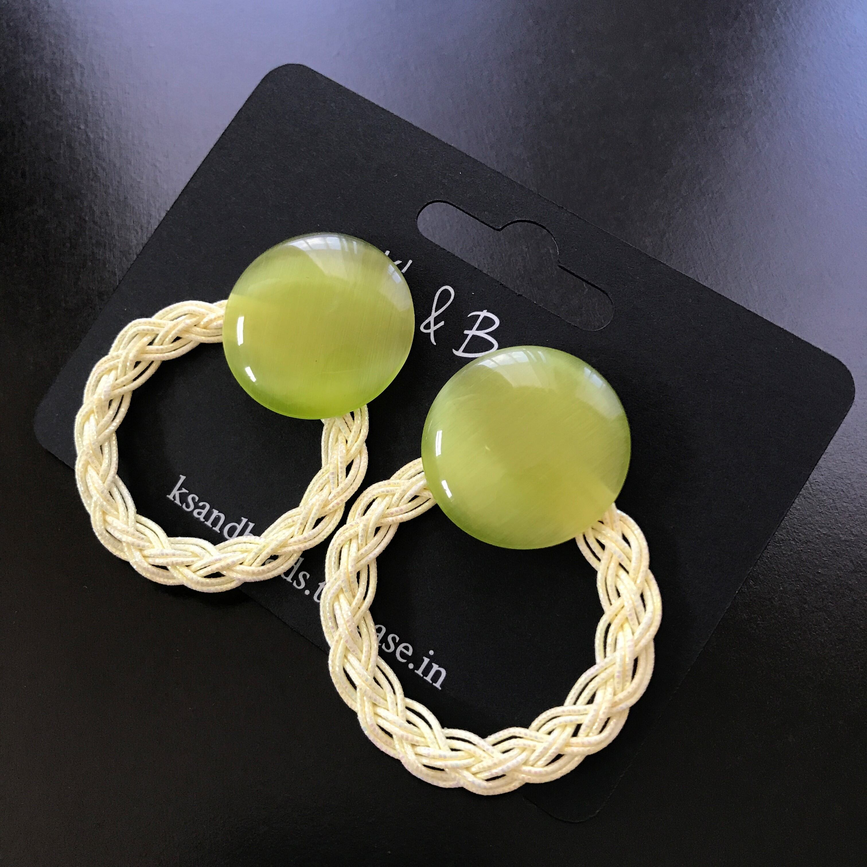 パステルイエローの水引フープにライムグリーンのカボションを付けた爽やかなデザインのピアス